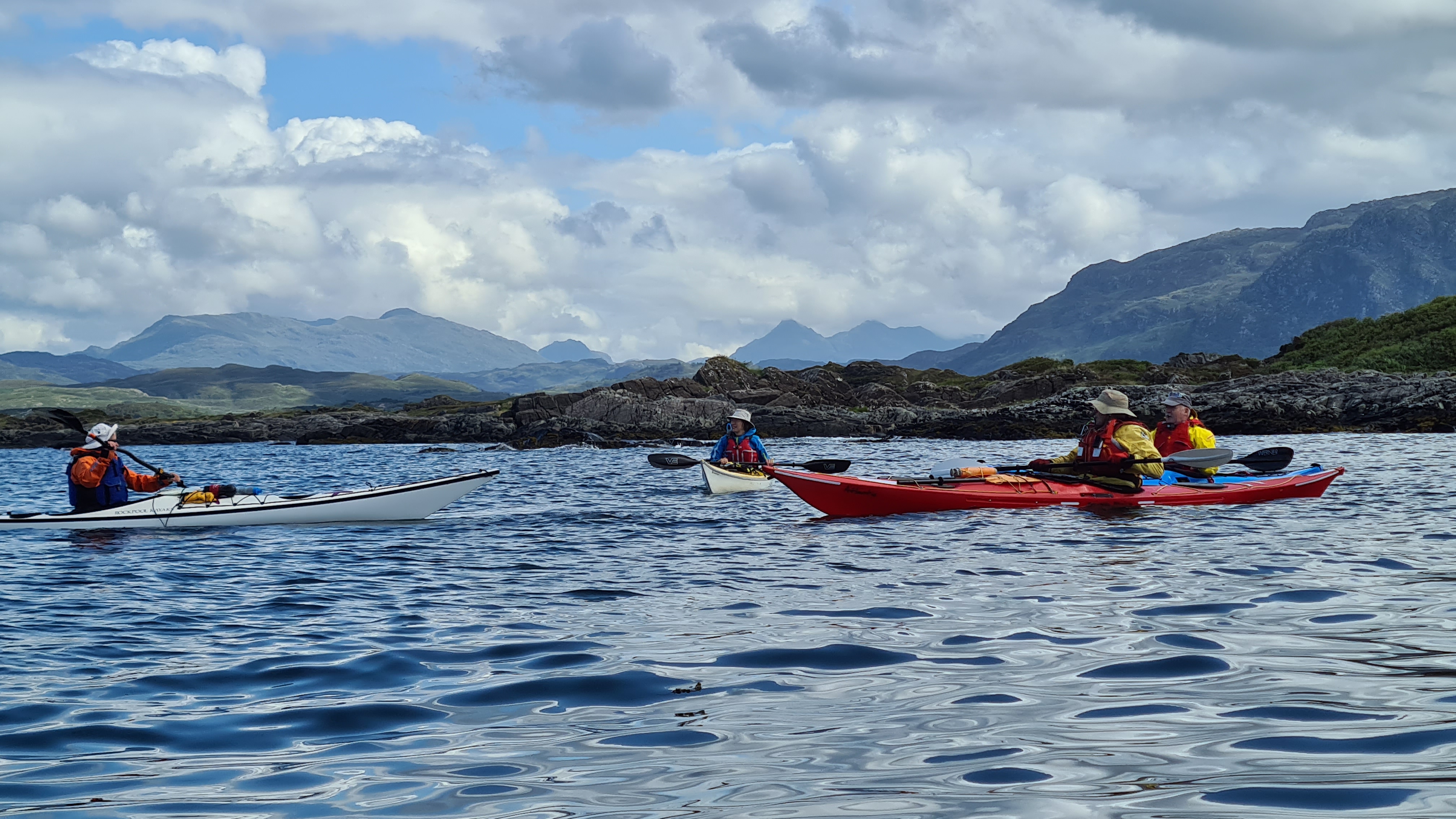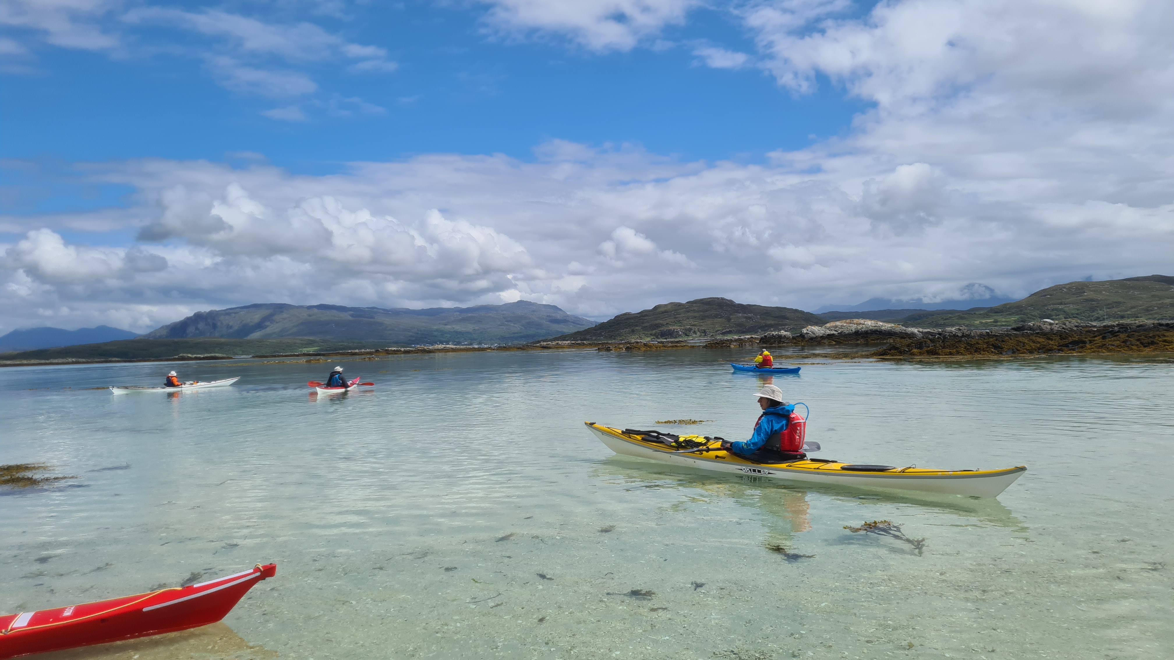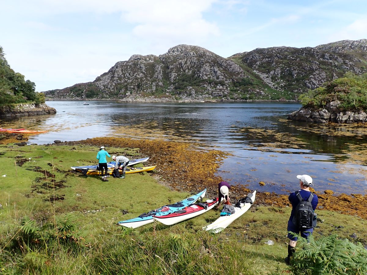 This was one of those summer days when coastal Lochaber seemed intent on showcasing all its finest features. The sun made an appearance, the wind did little to upset the sea, the small isles looked majestic, and the midges were enjoying a lie-in. A perfect day for a leisurely paddle around Loch nan Ceall, beginning and ending in Arisaig. Eight Club members set-off just before a mid-morning high-water, to ensure that they had sufficient water to get through the tidal channel between the Keppoch and Eilean Ighe. A leisurely pace was adopted; the boats gliding smoothly through unruffled water giving the paddlers tantalising glimpses to the seabed through swaying forests of bladderwrack; magical. A pull in on the sand beach at Gortenachullish, looking north towards Skye, was an ideal venue for a "first lunch." The conditions were so good that the team decided to change slightly from their advertised route to explore the west shore of Eilean Ighe. Lazy swells surging over the rocks and reefs gave a very enjoyable interlude to the sheltered waters inside the Skerries. Talk then turned to the question of where amongst the islets the best beach would be found for the much needed "second lunch". High water meant that there was a severe shortage of suitable real estate, and when on a couple of occasions, a suitable patch of sand was spotted it turned out to be already occupied by shore-parties from sailing boats in the south channel. After a looping exploration of the northern skerries, a tiny crescent of white sand was spotted and deemed to be big enough to accommodate 8 kayaks, and a landing was made. Once the party had consumed the rest of their rations it was decided that a B-line should be made back to Arisaig to get the barbecue lit for "lunch three". Of such days are memories made.