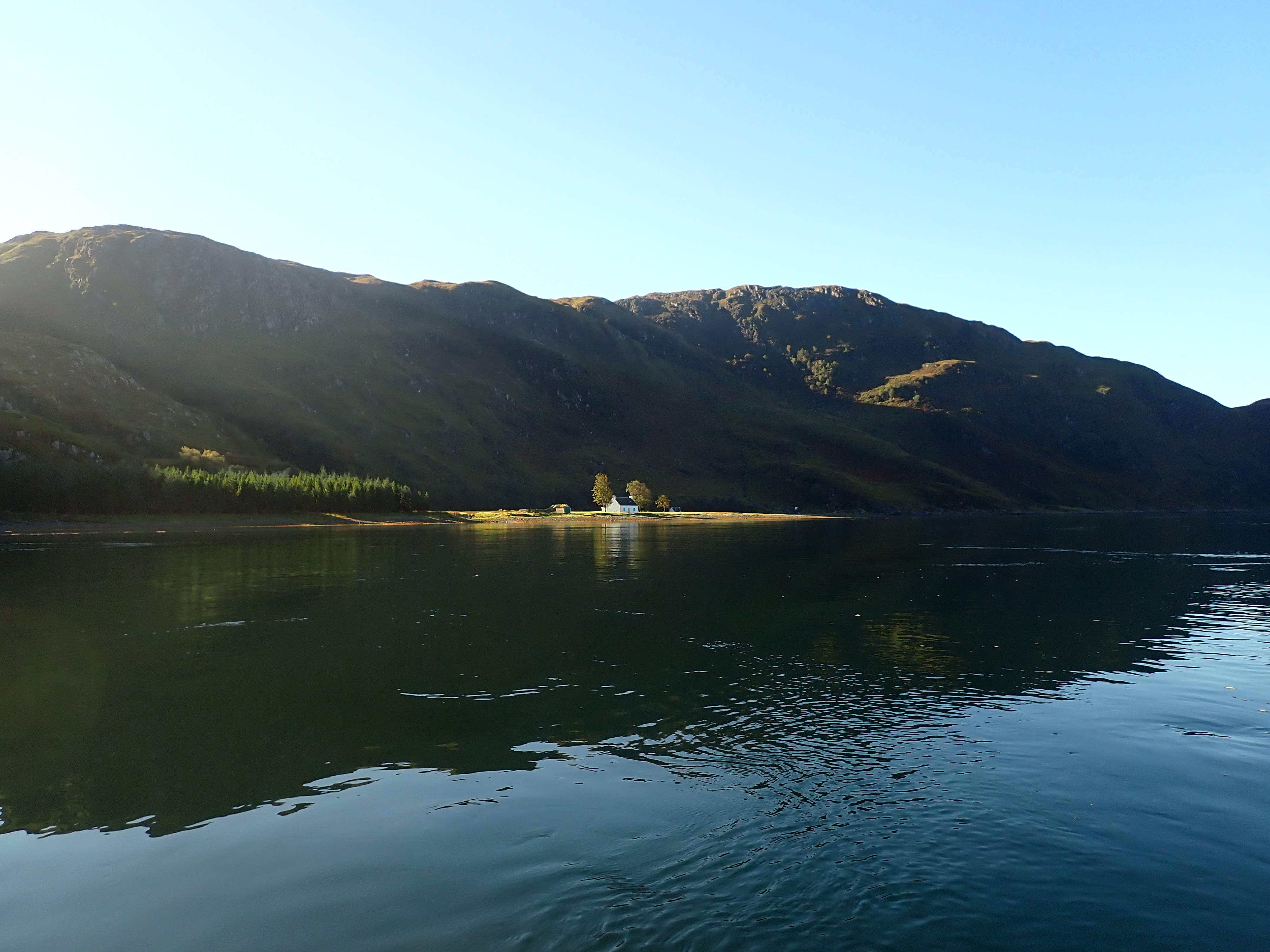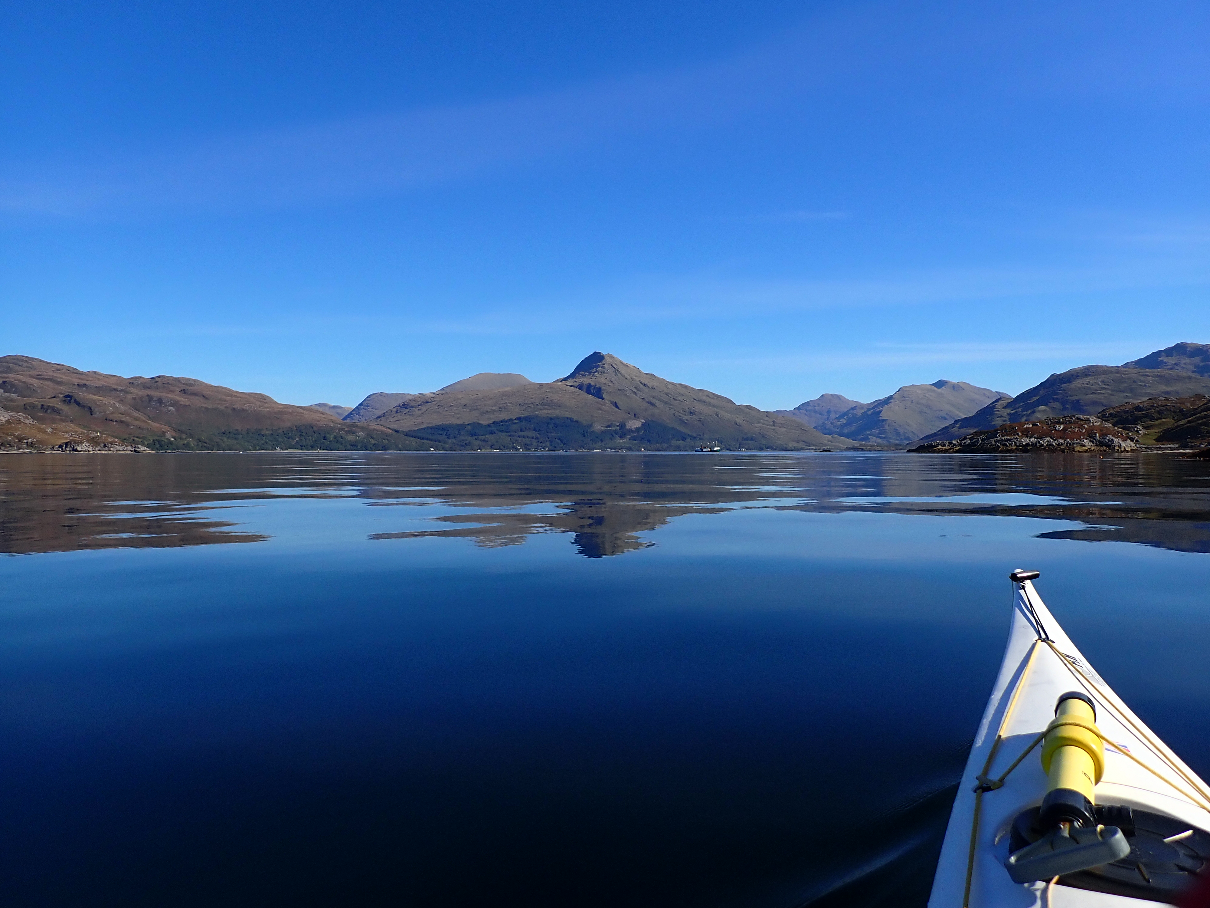 After the wettest of summers everyone was holding out for an Indian summer…and by golly the week beginning 16th September certainly delivered with perfect weather to undertake one of the calendar’s notional paddles to the head of Loch Nevis. The short notice meant that only two members set off from the slip below the boardwalk and paddled past the Lord of the Isles before turning into Loch Nevis on the calmest of seas under the bluest of skies. An hour of easy paddling brought the pair to the beach behind Eilean Giubhais for a quick cuppa before turning into the loch proper. After passing the fish farms they reached Stoul where great swathes of the hillsides are covered in the parallel lines of old lazy beds. Another quick stop was taken at Ardintigh before they paddled past Tarbet Bay and into the swirling waters of the narrows where the spring tide was gathering pace. Around 6km later they arrived at Sourlies Bothy where mercifully the tide was well in (it can dry out for over a kilometre there!). After a quick look round the bothy the paddlers returned to their boats and paddled round to the narrow stretch of land leading out to Eilean Tioram where they pitched the tents on a narrow stretch of raised ground behind the beach. Having anxiously watched the tide creeping ever closer to the tents a quick dinner was cooked after high water before the pair turned in for the night watched over by a herd of deer who were totally unconcerned by their presence.