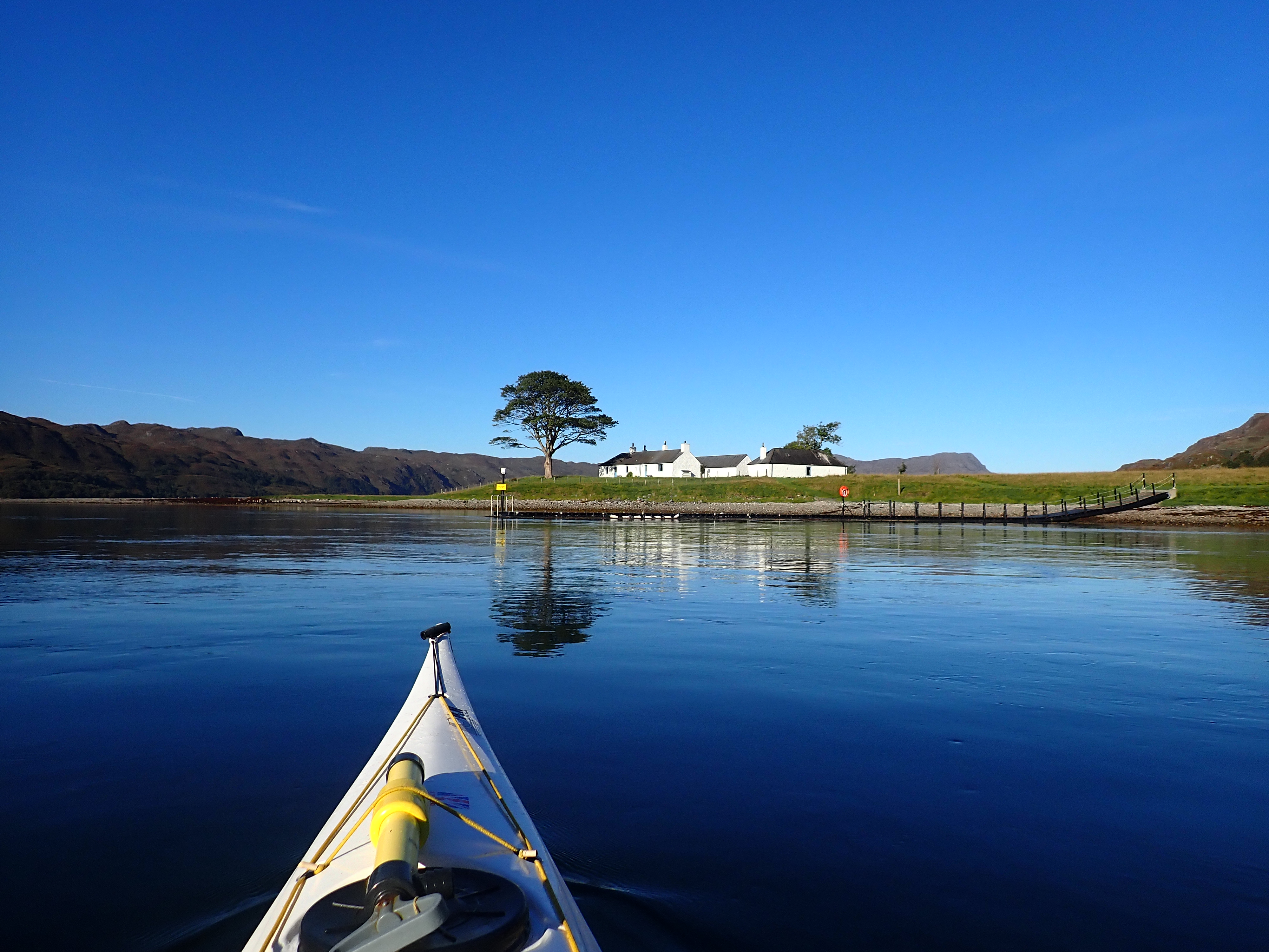 The morning dawned bright, clear and windless and the paddlers were on the water early to catch the ebb tide going back through the narrows. Here the views to the sunbathed white buildings on Kyles Knoydart and Ardnamurach were amazing. It was decided to hug the north shore of the loch before calling in at Inverie for a coffee at the café. They were rewarded with a magical encounter with an otter and seeing hundreds of sea urchins feeding on kelp under the water. After coffee and scones and a leg stretch at Inverie the paddlers set off round Inverie Bay and past Plastic Mary to begin the last leg of their journey back to Mallaig agreeing that it was one of the best trips ever!