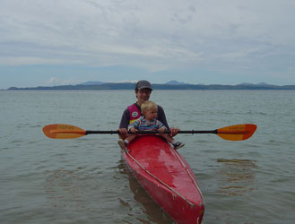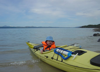 Back on the water after two days of rain and high winds. Mike left the Mazda as shuttle car at Lochmaddy and we put in at the pier at the head of the Loch Euphort, about one mile from the main east-west road. The tide was ebbing and it was an easy paddle down the narrow loch, with tidal action providing some play spots in places. We came ashore about 3km from the entrance to the Minch and enjoyed lunch in some very welcome sunshine. Out into the Minch, the calm sea and brilliant sunlight made for a stunning scene. We dawdled northwards, looking at the orange Ascidians hanging from the rocks and little Sea Gooseberry jellyfish. As we gathered in a little bay, a small boat motored over and the ‘sea dog’ at the helm called out that if we went over by the rocks he would attempt to feed a local Sea Eagle by throwing fish for it. Sadly the bird didn’t perform for us – apparently he had fed it earlier in the day. At the entrance to Loch Maddy, the three Americans, Roger and Jill decided to paddle back to the campsite; the rest of us going for a tour of the loch before returning for the shuttle car. We headed over to the north side of the loch and had a break that included some member of the party practicing their paddling party tricks – very entertaining. We went over to look at the Camera Obscura and then landed at the village slipway. After an enjoyable pint at the Loch Maddy Hotel we returned to camp. Paddlers: Mike & Sheila, Bill, Jill and Rebecca, Roger, Joe, Ed, Muffin, Chris Carter, EL, TL. 24km (return to base group did 34km).
