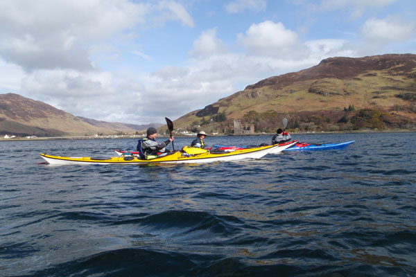 The plan to put in at Glenelg Bay was quickly dismissed when we saw the surf excitedly breaking into the bay, so put-in was re-scheduled to the ferry pier, as the ferry was not running. On the water shortly after 11a.m. we had a brisk push along the coast northeastwardsthrough Kye Rheaby the SW wind and a bit of tidal assistance. More compensating and bracing strokes than forward ones required. Once round the corner the sea calmed down a bit and we pulled into Ardintoul for "first lunch". Phil found a HUGE, live but battle-scarred, starfish. Continued north-east up Loch Alsh, past Eilean Donan Castle on the opposite shore, and into Loch Duich. With the wind still behind us we thought we were in luck, but heading across to check out the wind-against-tide action we soon found ourselves facing a stiff but manageable breeze that turned out to be the story for the rest of the paddle. "Second lunch" was a sunny affiar on the shingle beach beside the jetty between Leeterfearn and Duich House, then an amiable paddle up the rest of the loch to Ratagan and the awaiting shuttle cars. Phil went off to check ouyt the brochs at Glenelg then we met for a farewell cup of tea at the Cluanie Inn before heading our separate ways. A much better day than expected, given the windy and dreich forecast, and an excellent start to the Club's Touring season. Thanks Bill. |
