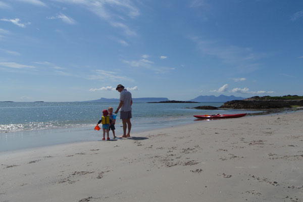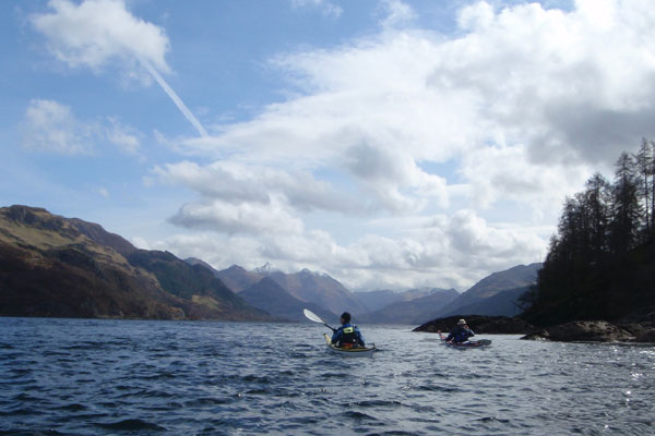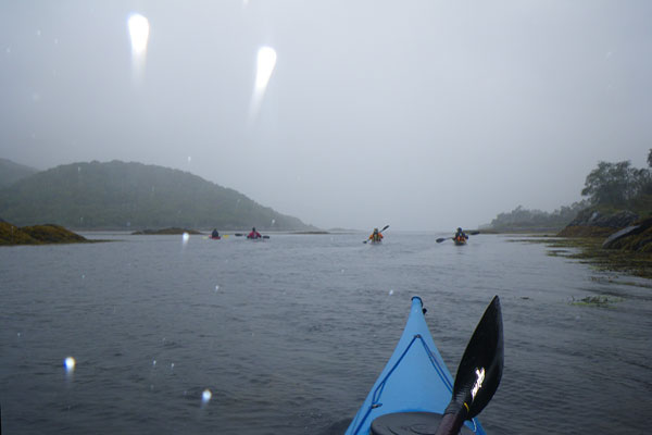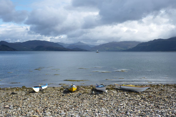 On Saturday with strong westerlies still blowing, one group decided to paddle from Kylerhea to Kyle of Loch Alsh and back to Kylerhea. With a stiff breeze at their backs the group raced with the tide through the narrows and round into the calm waters of Loch Alsh. On the crossing to and from Kyle the group again encountered wind and heavy showers. However by the time they headed back down the narrows the sea had flattened to an oily calm and the group had two close encounters with otters! Meanwhile, the beginner group paddled down the west shore of Loch Slapin which should have been sheltered from the west, heading for the beach at Kilmarie, a distance of about 5 km. Unfortunately the conditions suddenly and unexpectedly deteriorated but, although one member of the group became mildly hypothermic and two boats had to be retrieved from the east shore of the loch, everyone eventually returned safely to Torrin to enjoy an evening of paddling slides. It was great to see Alex, Suzanne, Joshua and Rory who joined us for the “party”!