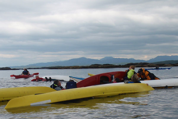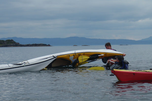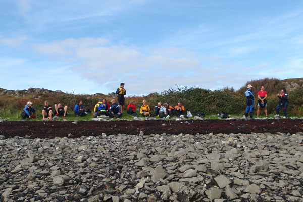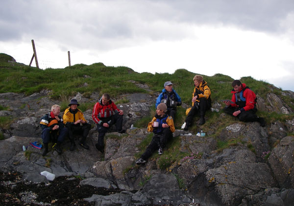 The first incident was a new paddler who threw a wobbly and refused to wear a spraydeck. There was much discussion about the best way of dealing with this. Next the group noticed that a paddler was missing. After some heated debate it was decided to keep the group together and send someone to a high point of land from where they might be able to see amonst the rocks and skerries. The terns weren't impressed, but the paddler was found safe and sound, much to the relief of the rest of the group who were more worried about finding a lunch spot than an errant paddler. Lunchtime involved discussion about a wide range of incident possibilities and the afternoon saw everyone jumping into wet and dry suits and coping with a range of imaginary problems in a wide variety of ways. |