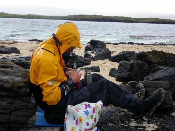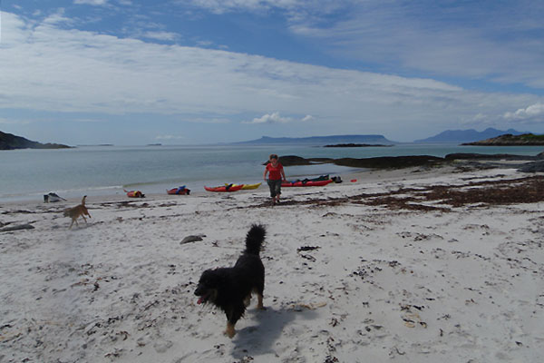 Spoilt again by beautiful weather we set off from Arisaig, where the sea was right up to the car park, and paddled into a flat calm sea in the direction of Morar bay. We had a few barbie rookies, so we tried to behave and look responsible, but that went by the board on arriving at the beach to be greeted by John with a bottle of beer each. Thanks John - very welcome. The journey out was just over 10 k. No-one seemed to want to hang about, so we arrived in very good time, stripped off to our undies to catch the rays and set about the serious business of lighting barbies and drinking in the sun. I had sent along a few barbeques in advance with John so we were able to start cooking straight away. John had also constructed a fantastic Robinson Crusoe style driftwood fire pit with a grill over it, which added that excellent authentic wood smoke flavour to everything. Willie, Nancy and Tilly turned up in their open canoe. Nancy’s dad, Donald, and the dogs walked in, as did Jane and the Turner family, all the way from Skye just for the day. Kebabs were very popular this year - delicious too. Special mention must go to Roger’s barbied Apple, Pear and Melon with crème fraiche and brandy - voted the best desert of the day. Also to Bill’s wacky idea, barbequed chillies covered with melted chocolate and sugar. It worked - made my mouth rather numb though. Gave Trevor and I hiccups too. We'll get you back next year Bill! |