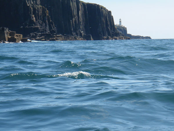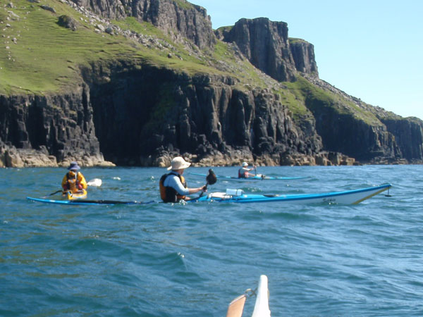 Saturday dawned clear and still. Having shuttled a car to Meanish Pier in Loch Pooltiel, we set off to paddle round Dunvegan Head with its amazing cliffs and views of the Outer Hebrides. Winds remained light and we had completed our intended journey by just after lunch. It was decided to paddle on round the next headland to at least catch a glimpse of Neist Lighthouse. Having stretched our legs on a boulder beach, we headed round in the strong tidal stream into Oisgill Bay with its towering cliffs, Biod Ban. By this time white caps were picking up on the Minch, so having caught sight of Neist Light, we turned into the slackening tide and strengthening head wind and headed back to the take out at Meanish Pier. Points of interest on the day were a sighting of a sea eagle flying across the cliffs at Dunvegan Head, a large heronry at Husabost, and the numerous large ships plying up and down the Minch including a huge cruise ship. |