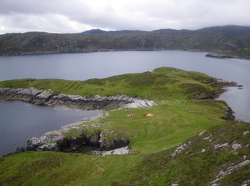 The camp spot was on the island nearest the shore which dries out at low tide. The views across to Skye and up towards Glenelg in the early evening sunshine were glorious, but the group were driven early to their tents by the dreaded midge!