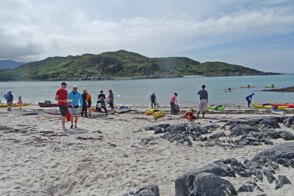 The beach at Ardtoe had a fair sprinkling of people on it enjoying the sun, sand and sea and fortunately they didn’t seem to mind being invaded by a large party of paddlers. After our (late) lunch break, we turned back for Glenuig and although there was an initial slight headwind, this soon died away and the afternoon was pleasantly warm, although not so hot that those in dry suits were parboiled. Roger Wild continued to amaze us with his rolling practice, although this was curtailed after he took his part in towing one of the group who was flagging on the return leg. We landed back at 5.30pm and the almost full tide made boat carrying a lot quicker than our morning efforts. Enjoying the traditional post-paddle pint at the Inn, there was general agreement that we had had a good kick-off to the touring season.