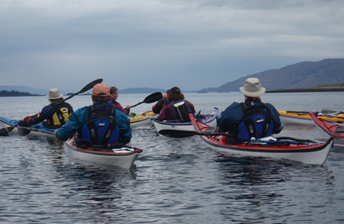 After weeks of wind and rain and two cancelled trips, the forecasts at last promised little or no wind and wall to wall sunshine for all of two days - all the time needed for the long awaited paddle to Tobermory on the Isle of Mull! Six paddlers set off from Laga Bay west of Salen on Loch Sunart and paddled on the out going tide towards the island of Carna. On this leg we were lucky enough to have a close encounter with three porpoises who came within feet of our boats before diving deep. We managed to squeeze through the narrows between Oronsay and the mainland at Doirlinn before they dried out, and paddled on down Loch na Droma Buidhe. Having lunched at Auliston Point, we set off across the Sound of Mull watching out for the many ferries and small craft that ply up and down this busy seaway.