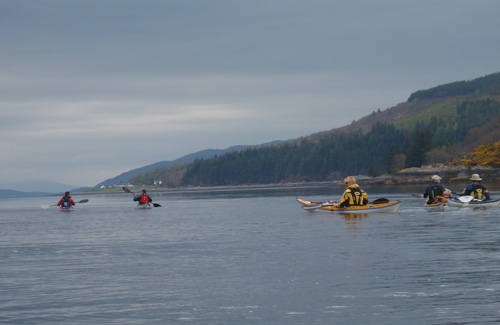 Arriving in Tobermory on a still ebbing tide, we left the kayaks where we landed and headed straight for the ice cream shop! Some paddlers found that they did not have enough hands to manage the melting ice cream and the scalding coffee! After an hour browsing the great array of shops on offer in Tobermory and promising ourselves a return trip to do the Christmas shopping, we retrieved the kayaks and headed off past the lighthouse at Rubha nan Gall for our intended campsite at Bloody Bay (so called after a sea battle that was fought there). The landing was at low water on a boulder beach, so it was decided to unload the kayaks, tether them and let the tide float them in up the obvious boat slip that had been cleared by previous residents. The tide did the job very well, and deposited the boats high up the beach, leaving us a short carry to above the high water mark. During the evening, despite scouring the whole area, we found no evidence of habitation, but we did however have two sightings of sea eagles!