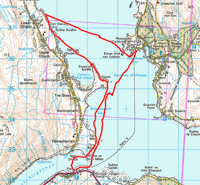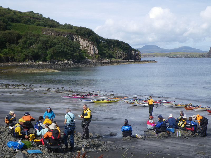 It had been decided the night before to paddle on Sunday from Sconsor to Tianavaig and back via Raasay House for afternoon tea! An early call (burnt toast....fire alarm!) had the group up and about early on Sunday morning and they were packed up and ready to go by 9.30am and heading for the new ferry terminal at Sconsor with car parking, toilets and a waiting room – treats! The conditions were very benign with flat calm waters and blue skies and the group (22 in total) became a bit strung out as they investigated caves and cliffs along the way to Tianavaig. Lunch was taken on a stony beach where a border collie named Meg insisted that sticks should be thrown into the water for her! After an easy 3km crossing to the island of Raasay, the group paddled between Eilean Aird nan Gobhar and Raasay and landed on the beach below Raasay House. Members of the group sat at picnic tables outside and drank their teas and coffees looking out over the Narrows of Raasay towards the Cuillin mountains. An hour’s paddle saw the group back at Sconsor and dodging the arrival of the Raasay ferry.