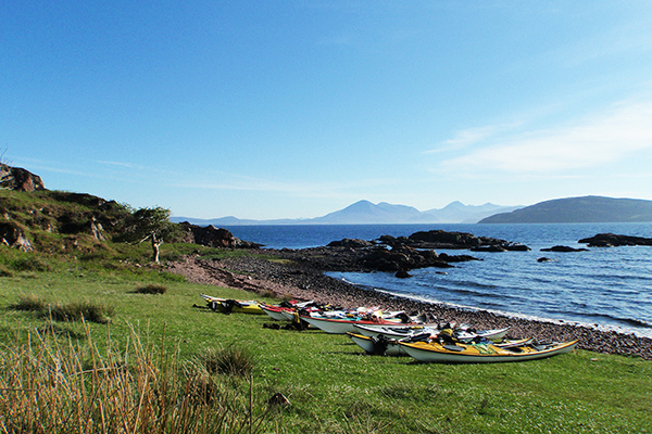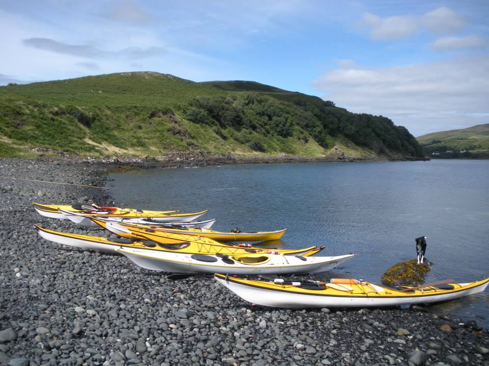 A doughty group of paddlers set off from Stromemore late morning on Friday the 7th of June in wonderful sunny warm weather. The first stop was the mouth of Loch Kishorn for lunch. The day’s journey was in warm sunshine, on calm seas with wonderful views of Skye and the Cuillin Mountains. That is until rounding the point at Rubha na h- Uamha into the teeth of large seas and a solid Force Four. As we approached the boulder beech at Uags several helpful chaps ran down to help them with a tricky landing. These proved to be members of a Tayside club who had been camping there all week.