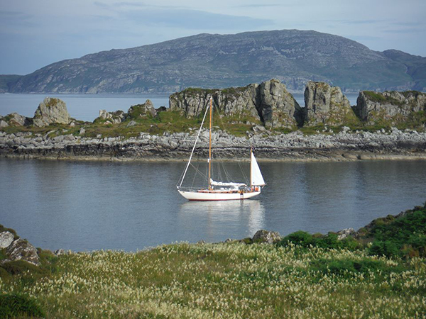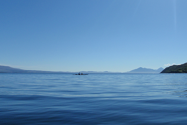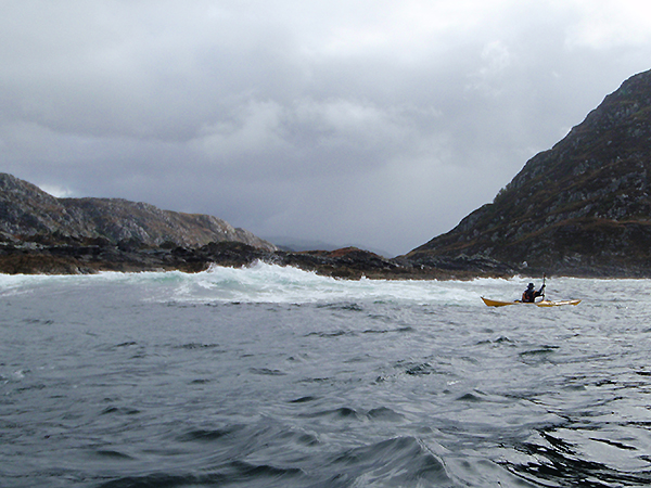 The sun was shining and the sea was calm as the group set off past Samalaman Island, round Rubha Ghead a Leighe and out of Loch Ailort. Although there was very little wind, there was a noticeable swell and the paddlers stayed out from the shore to avoid the worst effects of the clapotis. They passed the small township of Smirisary and paddled between the islands of An Glas-eilean and Eilean Coille before crossing the entrance to the North Channel and paddling along the rugged western shores of Eilean Shona.