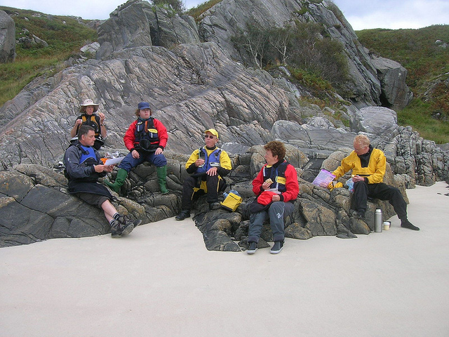 The tide was almost at its lowest as the group launched and set off across Loch nan Ceall (Arisaig Bay). As the shortcut through the channel at Gorten was dry, the group had to go round Eilean Ighe where they overtook a group of kayakers from Oban who were exploring the islands of the loch. This stretch of coast past Back of Keppoch, Bunacaimb and Portnaluchaig is dotted with white sandy beaches and skerries which make for interesting kayaking. It is also home to numerous caravan sites whose residents were out fishing, swimming, sailing and paddling as the group stopped for lunch on a sandy spit just south of Portnaluchaig. Lunch was over when the rising tide began to cover the spit and carry away the kayaks!