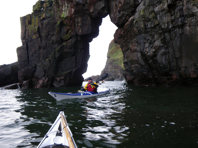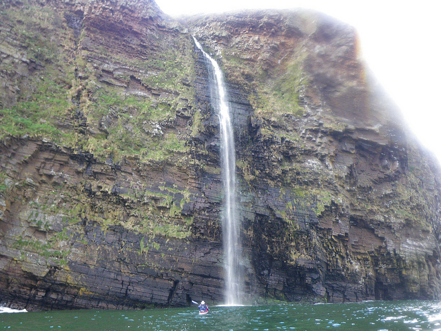 After arriving at Loch Beag the nineteen were joined by four other club members, making a large group of twenty three paddlers. The group headed out of Loch Beag, crossing the mouth of Loch Harport and rounding Ardtreck Point before stopping for “first lunch” on the sandy beach of Fiskavaig Bay. After lunch the group had a committing 7km paddle to Talisker Bay with no opportunities to land. Having paddled under some amazing cliffs and waterfalls, the group rounded Rubha nan Clach and started to encounter swell which was breaking on the rocky coastline. The highlights of this stretch were some caves and a sighting of a golden eagle. Rounding Rubha Cruinn, the group got their first sight of the sandy beach at Talisker. Definitely time for lunch number two and a comfort stop! Their hopes were dashed when it was decided that the dumping surf would make it too difficult to get all 23 paddlers safely ashore. Four of the group decided to give it a go and landed successfully. The rest ate lunch in their boats and headed back for Fiskavaig to stretch legs before the last leg back into Loch Beag. Two sea eagles were spotted on the cliffs just before Fiskavaig.