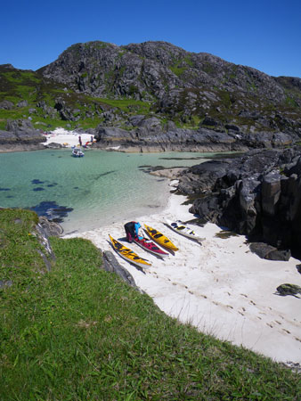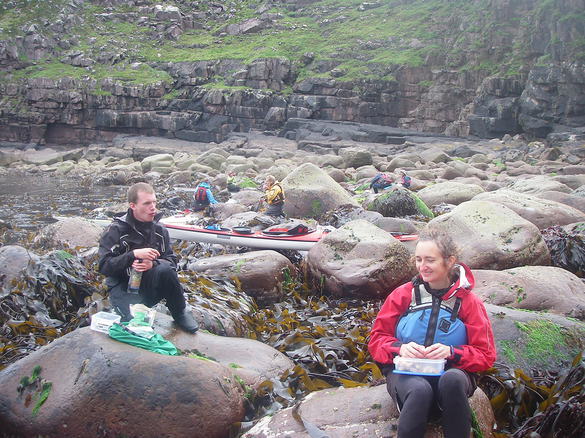 The trip round Stoer Point started at Clashnessie Bay in a steady drizzle which soon cleared allowing the paddlers to explore the many caves along the east coast of the peninsula. It was decided to push on round the Point before stopping for a break to ensure slack water. The highlight of the trip was the great view of the Old Man of Stoer which opened up as the group rounded to Point. Although the tide was very low, the group was able to paddle between the stack and the mainland. One member even managed to fit a sail to his kayak and negotiate the narrow channel! Lunch was taken at a “beach” below Stoer lighthouse. This proved to be a very difficult exercise with large round slippery boulders to negotiate. The Bay of Stoer was chosen for the second break before the paddlers completed the 22km day in flat calm conditions at Ardmelvich Bay adjacent to the campsite. |