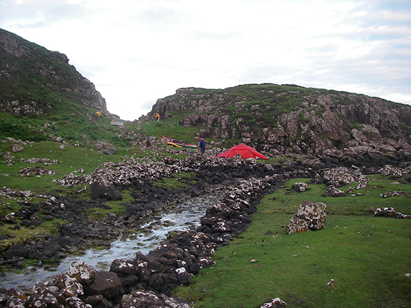 Monday was a cold and showery day for a twenty five km. paddle up Loch Scavaig, round the East Coast of Soay and along the Soay Sound to the Viking canal on Rubh an Dunain. After so many open crossings we all very much appreciated a bit of coast line to paddle along. The campsite that night was quite magical but there is not space for many tents. Also, getting the boats back into the water in the morning over seaweed strewn boulders was difficult and strenuous. |