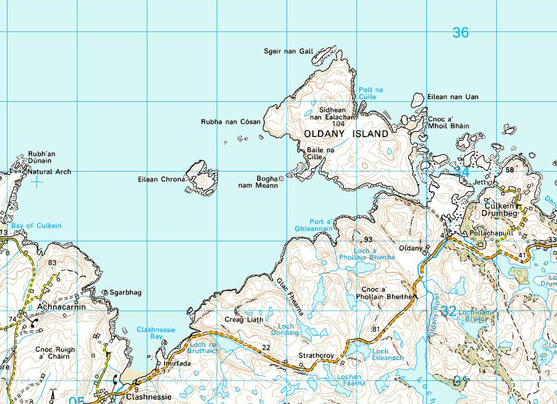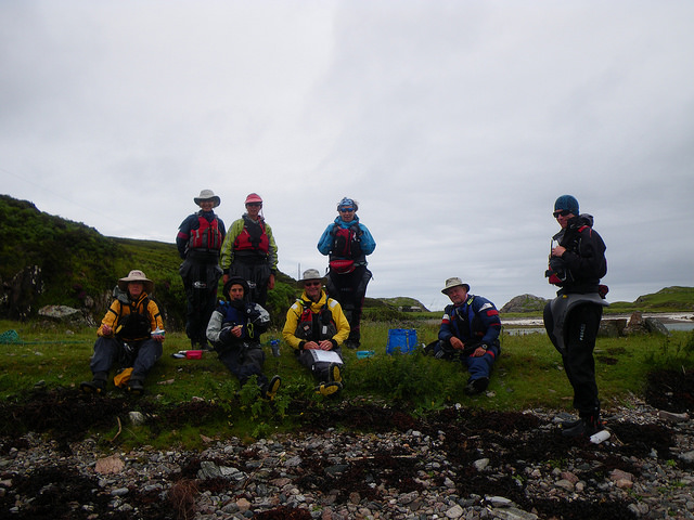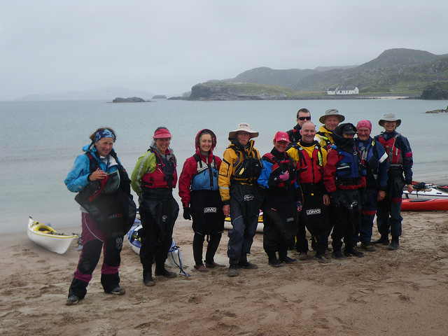 A very wet night was followed by another drizzly morning for the circumnavigation of Oldany Island. As forecast, the wind had freshened, but was behind the main group which again set out from Clashnessie to tackle the circumnavigation anticlockwise. Three paddlers had decided to shorten their day by setting off from Culkein Drumbeg further west and paddling clockwise round the island. Conditions on the water for the main group were very confused for the first few kilometres until the calm waters of the narrow channel which separates Oldany from the mainland was reached. There was some debate as to whether this channel ever dries out! If it does, some would say that Oldany isn’t a true island, although we were assured by a local fisherman that it never dries out completely. Once through the channel the water was calm and the main group stopped for lunch at a beach below the only dwelling on the island. They were soon joined by the other three paddlers who had been foiled in their attempt to get round the island by a “wall of water” encountered at far western Rubha nan Cosan. After lunch it was decided to join forces to paddle up the east coast of Oldany as far as the northern tip to assess the conditions. From there two paddlers continued round to Clashnessie to collect cars while the others paddled back to the jetty at Culkein Drumbeg. Once the shuttle had been completed and boats loaded, the group took tea at the secret tea garden in Drumbeg village (well worth a visit!). |