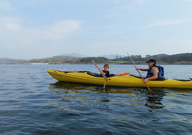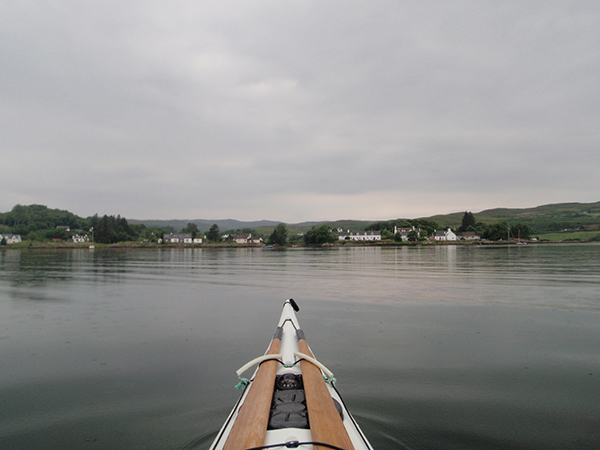 Following a chilly but fine night, we launched at 9.30 and headed northwards on a glassy sea for Grass Point. Like the previous day, we regularly saw shoals of frenzied fry at the surface, presumably trying to escape predatory fish (probably mackerel) harrying them. Retracing our route as far as Port Donain, we landed for a leisurely break before paddling into Loch Spelve. Arriving just before mid-day, the outgoing tide was by now flowing weakly and didn’t impede our progress. As we finished the paddle at the western end of the loch, a man in a boat offered us a lift back to Loch Buie, which was very kind of him but not needed as we already had the necessary wheels in place.