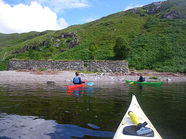 The first stop was at Inbhir Beag bay to look at the old chapel. Pushed along by a gentle westerly breeze the paddlers landed at Brinacory where there had been a small village with a school which is still standing. After lunch it became apparent that the breeze was beginning to pick up, raising little white caps on the surface of the loch. Having paddled the kilometre across the loch the group reached the south shore and shelter behind Eilean Allmha. The south shore has a wilder feel about it with only isolated deserted settlements along its shore where there was water and some flat land to cultivate. Lazy beds were much in evidence as the group paddled into the stiffening westerly breeze. They lingered at Lettermorar, admiring the dry stone wall which formed the rear boundary of the settlement. Building this wall must have been a herculean task for the three or four families who lived there. Leaving the shelter of Lettermorar the paddlers could see that skies to the east were darkening ominously and the rain began to fall in earnest. However it was warm rain, so it was decided to continue paddling without cags!