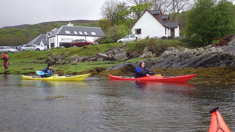 On Sunday 1st June a group of eight paddlers set out on an A graded paddle from Lochailort to Glenuig. The forecast had warned of gusty winds, so it was decided to stick to the south shore of the loch to gain as much shelter as possible from the south east wind. This worked to a certain extent, although downdrafts from the hills were challenging. The group planned to stop at the beach adjacent to Roshven House for lunch, but as they landed they were confronted by the landowner who politely claimed to own the foreshore and the right to refuse access. Discretion being the greater part of valour the group decided to push on to the next bay for lunch. The last kilometre into Glenuig was against a strong easterly rushing down the valley from Loch Moidart.