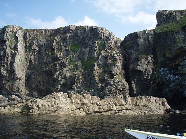 By the time we reached Loch Scresort we decided that Eigg should be our goal for the day and we would risk the weather forecast. We aimed for Camus Sciotaig and its Singing Sands. There are two things to note here! According to Doug Cooper and George Reid in their book Scottish Sea Kayaking we should have endured about a three knot tidal stream passing through the Sound of Eigg. This tidal stream is not to be found in the yachting pilots and we found no evidence of it on the water. Next of note is that storms have radically changed the beach at Camus Sciotaig. Where the beach was is now a boulder garden surrounding a small lagoon. This is protected from the sea by a sand bar with a channel opening to the lagoon. This is a surf beach, though not a scary one usually. But note that there is a second sand bar just in front of the main one. You will get stuck and dumped on and pushed about in the surf on this hidden sand bar. So, when going for the shore, aim for the channel that leads to the lagoon. You won’t paddle down it but you will get a more comfortable landing. Having said all that, it may have all changed again by the time a return is made. Oh, and look out for the sphinx.