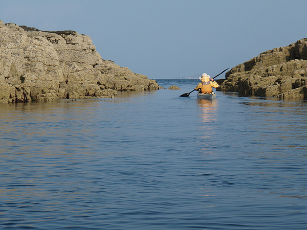 online, mine host turned out to be very friendly and the facilities very clean, with plenty of space on the freshly mown field above the static caravans. A grey but calm morning saw the arrival of a few more early risers and a couple of vehicles were shuttled to the head of Loch na Cille. Launching into Carsaig Bay, the brief glimpse of an otter was a good omen for the paddle ahead and despite low water we were able to hug the shore and squeeze past various rugged eilean at the head of the peninsula. Jura dominated the view to the west and the Paps gradually appeared out of the cloud as the weather improved. In the absence of any sandy bays, we were able to pull out for lunch near the jetty at Keillmore before paddling directly to Eilean Mor, largest of the MacCormaig Isles. For a short time owned by the Scottish National Party, the considerable remains of the 9th century chapel and the tiny rocky cleft chosen by St Cormac for his retreat a couple of centuries earlier are well worth a visit. Back on the water we skirted the Island of Danna into the sheltered waters of Loch na Cille where our vehicles awaited. To round off a fantastic day we enjoyed an excellent meal together in the Tayvallich Inn, washed down with some very tasty beers from the Loch Ness Brewery in Drumnadrochit.