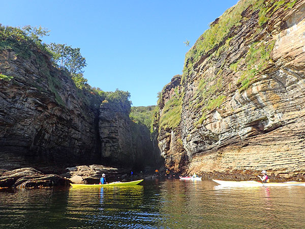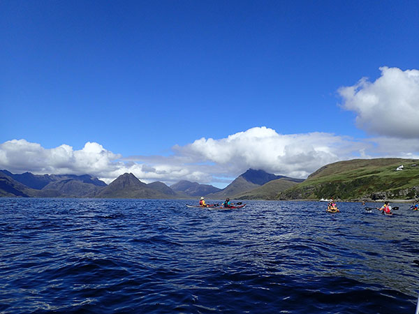 We awoke on Saturday to a clear blue sky- it was hard to get our heads around our good fortune after the recent run of poor weather. Our objective for the day was Spar Cave, so we launched straight from the Centre. After a break on the beach at Kilmarie, we continued south and were rewarded with very close views of a White Tailed Eagle. Unfortunately we missed Spar Cave owing to the trip leader forgetting its exact location, but we carried on to the south end of the peninsula and lunched in glorious warm sunshine. Now less than two kilometres from Elgol, it seemed churlish not to pay it our respects, so off we went, Sheila spotting an otter just as we paddled out of the bay. We didn't linger at Elgol; time was pressing and crucially, there was no handy ice cream shop. On our return leg, the leader redeemed himself and found Spar Cave. Torches in hand (and on-head), we headed into the gloom and scrambled up the steep, wet slope; fortunately the rock underfoot was very grippy. Back in daylight, we headed for 'home', getting some good views of Gannets and Cormorants on the way. An outstanding day's paddling was followed by the usual sumptuous Saturday night feast and slide show. Bliss! |