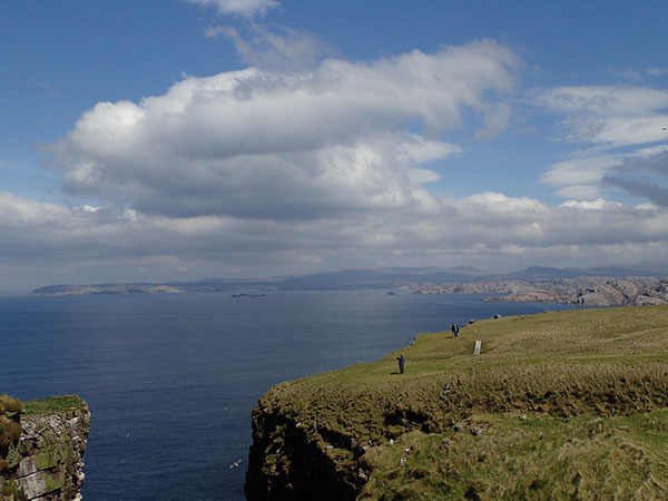 By midday the rain clouds had cleared away and we were treated to a beautiful day on the island, picnicing on the cliffs and watching the seabirds soar and the occasional Risso's dolphin frolicking far below. Bonxies, arctic skuas, gulliemots, gannets and tysties (just for a start) were spotted but no puffins!