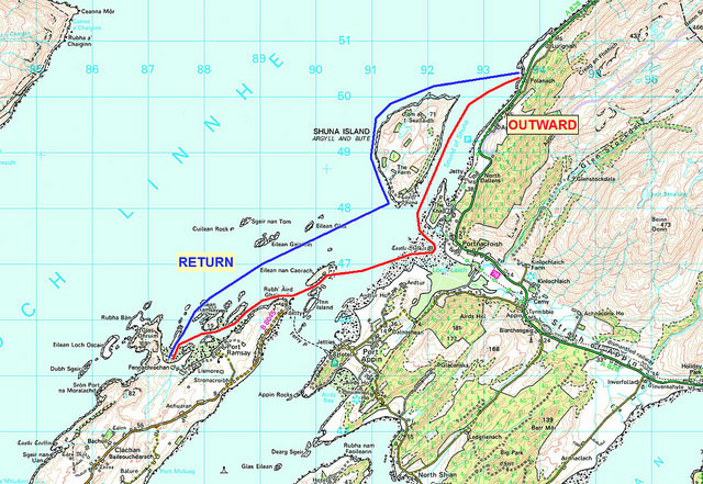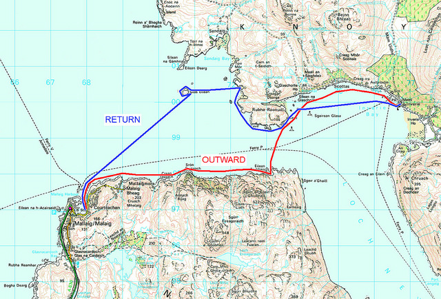 After leaving a car at Samalaman, 7 of us assembled at the jetty at Kinlochmoidart. Though breezy elsewhere, not a breath of wind disturbed the voracious midgies, so launching was a hasty affair with little chat, only mutterings!