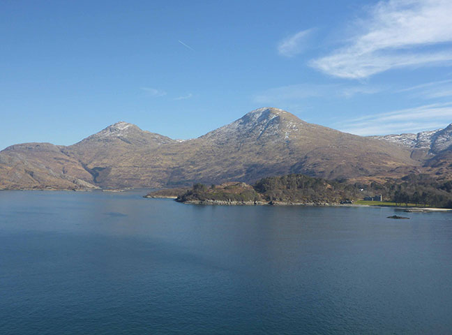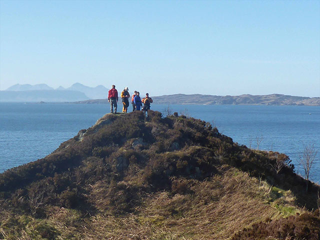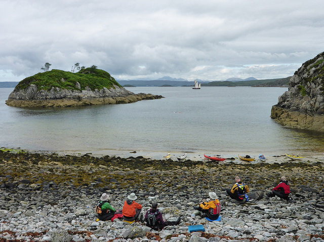 The meeting at the jetty was scheduled for 10.00 but the weather was so good most people were there well before then. We launched just before low tide and paddled down the loch in sunshine, virtually no wind and superb visibility. Were we lucky or what! A coffee and comfort break was mooted and we came ashore at Peanmeanach, surprising a young man having a chilly dip in the briny. Fortunately he was wearing swimming trunks, so mutual embarrassment was avoided. Continuing along the coast, we rounded the northern tip of Eilean a’ Chaolais to encounter some swell and wave action. A few played, the rest kept going and came around the south end of Eilean nan Gobhar to land on the cobble beach. A relaxing lunch in the sunshine was followed by the traditional pilgrimage up to the vitrified fort, from where we had great views out to the Small Isles and of the nearby Roshven hills.