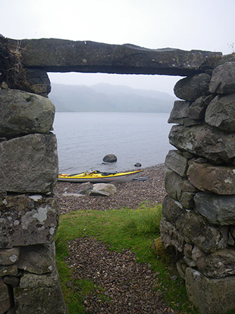 Six paddlers set off from the beach under the railway viaduct at Glen Mama just west of Lochailort. Conditions were perfect if slightly hazy, with only a light breeze to keep them cool. They crossed the mouth of Loch Beag and on under the steep hillsides of Eiridh Gharbh. Conditions remained calm as they rounded the first headland and looked back to the deserted settlement of Slochd. On rounding Rubha Chaolais and paddling inside Eilean Chaolais, great views opened up of the Roshven hills and the islands of Loch Ailort, all layered in shades of grey. A quick decision was taken to paddle over to Eilean nan Gobhar (aka Goat Island) for lunch. The beach on the eastern side of the island boasts some beautiful stones and a few of these were secreted inside hatches to enhance a local garden! Mid lunch-break a thick mist rolled in from the west which obliterated sight of land in all directions. On leaving the beach there was still no sign of land, so the group set a course of 60 degrees hoping to reach Peanmeanach, one and a half kilometres away. Although the haar was very disorientating, the paddlers eventually sighted the bothy and ruins of Peanmeanach right in front of them and after a few photo opportunities, set off along the north shore of the loch past Laggan cottage and on through the narrow channel between Eilean Buidhe and the shore where the outgoing tide was still apparent. The rest of the paddle to the take out at the jetty just west of Inverailort was uneventful apart from the sighting of a couple of eider duck. A lovely paddle of some 16.5km….Great weather and great company! |