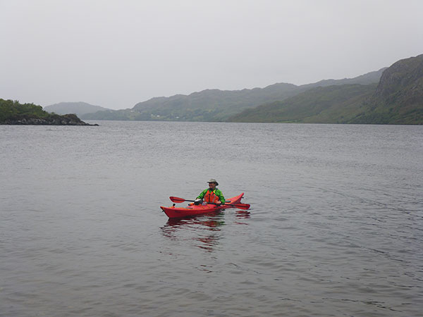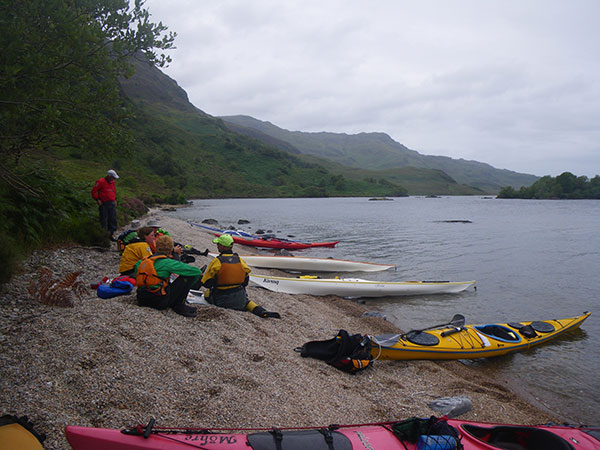 Sunday morning dawned clear and warm. Camp was soon broken and the group were heading down the Loch past Eilean Mhogh-Sgeir towards Kinloch Hourn for morning tea! Luckily the tea shop was open and coffee, tea and cake was enjoyed by all before heading back up the loch in a stiffening breeze past Skiary and Runival toward the lunch stop at Barrisdale. Paddling through the narrows was quite eventful with a lot of chop on the water. Leaving Barrisdale under a darkening sky and heading for the proposed campsite at Croulin, the group encountered a strong north westerly wind blowing straight up the loch. After about 5km paddling against the wind, the group found shelter behind Eilean a Phiobaire, before heading for Croulin. On arriving there it was decided to push on back to Slisneach for the last night’s camp spot. After the heat of the previous days it was on with the down jackets as the NW wind cooled the temperatures right down. However, another bonfire helped to heat everyone up and it was off to bed early as an early start was needed on the last day.
