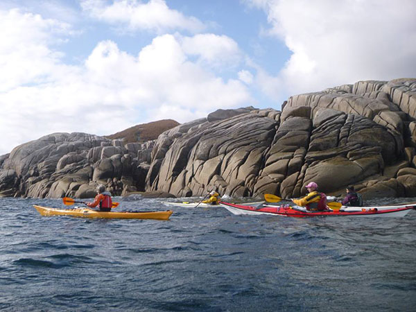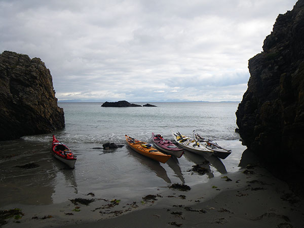 As the forecast for the Friday looked reasonably cheerful and benign, 5 of the 6 paddlers met at the Lochaline ferry with a plan to paddle in the afternoon. Uisken seemed a fine and satisfactory base, so, after setting up tents and having a cuppa, an outing was taken to the west into a moderate breeze. After crossing the large, sandy bay at Ardalanish, they followed the coast, with good views across to Jura, Colonsay and Islay. There were some interesting rock formations. At Rubh’ Ardalansish the seas became pretty lively and there were no stopping places within the allotted time, so, heading back the way they had come, they snuck into Port Faoileann a’ Chlachanaidh for a stretch and a cuppa. From here there were lovely views eastwards to the imposing cliffs of Malcolm’s Point, with the various outcrops tinted in the late afternoon shades of grey. Back at camp paddler number 6 wandered in from a spot of fishing and a convivial evening of eating, drinking and singing-along-a-Cairns ensued in Ruth’s cosy campervan haven, sheltered from the evening’s rain.