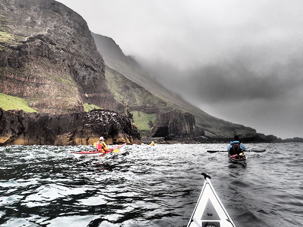 Saturday dawned misty, but not cold. Setting off at 9.00 into the grey mizzle, an amiably lively sea and a moderate head wind, the day’s outing was eastward, heading for Malcolm’s Point and the Carsaig Arches. Passing the various sandy bays an otter was spotted by some. After rounding Rubha nam Braithrean, a sandy stopping place was discovered at Port nan Droigheann for a short break. Heading along the cliffs eastwards a white tailed sea eagle soared above the cliffs. The sun made some half-hearted attempts at breaking through the mist, without success. The waterfall at Traigh Cadh an Easa’ (beach of the pass of the waterfall) beckoned, but, having only recently stopped, it was decided to delay gratification till the return journey, hoping it might be a good location for the traditionally sunny lunch stop. The cliffs along this section are a stunning, plummeting carpet of green from summit to sea. Approaching Malcolm's Point the cliffs became more rocky at the base. The group, being hungry by now, were getting just a little impatient to find the arches, but were rewarded before patience ran out entirely. Approaching from the west, the spectacular main arch and its isolated cathedral-like outcrop, are not come upon to best advantage. Paddling past and taking in the view from the east was better. Sadly the mizzle had not relented. After fairly slow progress into the not problematical wind all morning, there was excited anticipation of getting a push homewards. Returning to satisfy gratification at the waterfall they found the shoreline, following the turned tide, was surfy and not a tempting landing spot. Below the cliffs of Cadha an da Luain (Monday Pass) was a huge flock of feral goats. After marvelling at the waterfall and a low fly-past of the sea eagle, chased by a crow, a speedy retreat was beaten to Port nan Droigheann for a well-deserved lunch break. Just in time the sun won and the tradition of the sunny lunch was upheld and enjoyed. Heading off, refreshed, with the sun shining, the offshore islands in view and the wind from behind, all was well, but it was no more than 5 minutes before the wind did its usual trick of veering 180 degrees. At the same time a considerable swell rose up, so that people came and went in the dips. Although maybe a bit more lively in places than some would have wished, it was thoroughly enjoyed. In this way the group made a fairly straight bee-line back to Uisken and the evening’s entertainment, which included, amongst other things, a practise roll, Traighathlon swim training, a quick dip and another sing-song.