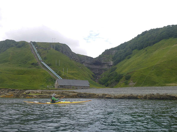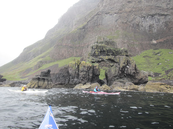 Saturday dawned clear and calm and after running the shuttle to Staffin the group set off from Portree bay past Sgeir Mhor and turned north sighting a sea eagle almost immediately. A southerly breeze had picked up by that time which persisted throughout the trip. This gave the paddlers a good push on their way! This stretch of coastline is very unforgiving with no means of escape if the weather cuts up rough, so careful planning is essential before tackling it. The group paddled past Prince Charlie’s cave and Holm Island before their first lunch stop at Bearreraig Bay. With the outgoing tide this proved to be a difficult landing characterised by large barnacle covered boulders and slippery seaweed. Refreshed by their snack the paddlers pushed on and after 4km were treated to various arches and stacks and sightings of golden eagles and otters. The rock formations here are amazing, comprising sedimentary rock with large round boulders protruding from the distinct layers. Second lunch was taken at Inver Tote where the remains of a large industrial building is evidence of the diatomite industry established in 1899. From here the diatomite was shipped as far away as South Africa. After passing Rubha nam Brathairean (Brothers’ Point) where a dinosaur footprint has recently been found, the group came to the main event - Kilt Rock so called because the towering vertical basalt columns resemble the folds of a kilt (or alternatively because part of the rock formation resembles tartan!).