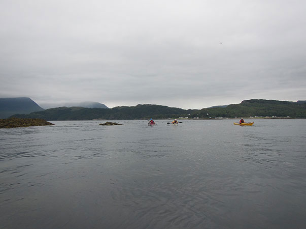 After landing at Staffin slipway the boats were loaded onto cars for the journey back to the campsite and fish and chips for some! After supper the paddlers gathered to study the forecast for Saturday which wasn’t looking very promising with increasing winds and significant gusts. It was decided to break camp in the morning and drive to Plockton to assess the conditions before making a final decision.The original plan was to paddle round the Strome Islands and head for the Kishorn islands before returning to Plockton. Although it was reasonably sheltered in Plockton it was decided to paddle up the south shore to maximise the shelter on offer and head to the Strome Islands missing out the more exposed Kishorn Islands. After paddling along the shore overlooked by the Kyle railway line the group stopped for lunch at Portchullin before paddling out to the Strome Islands. With the outgoing spring tide at its strongest and the gusty wind against the tide the conditions on the paddle back to Plockton were interesting to say the least! Thank you to all who came along and contributed to such a great weekend of paddling!
