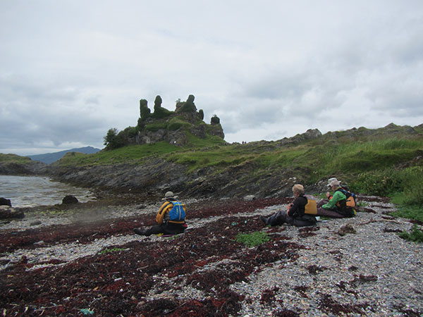 The weather was calm as our group of six left the head of Loch nan Uamh and made good progress on an outgoing tide. However by the time we reached Druimindarroch the wind had increased to a force 3 from the south as predicted. We stopped at An Garbh Eilean for our first lunch – a sheltered spot recommended by Stephen – but didn’t linger as the tide was due to turn at 12.20. We then paddled west along the exposed stretch of coast to Eilean a’ Ghaill for our second lunch. The remains of the fort on this island are on a superb position on top of steep rocks with commanding views all around. No signs of vitrification though. On our final leg of the paddle we took as much shelter from the islands as possible and soon turned the corner into the shelter of the south channel where we could relax and enjoy the remainder of the paddle to Rhue jetty. Distance paddled 18km.