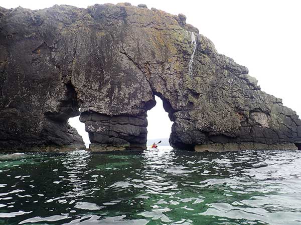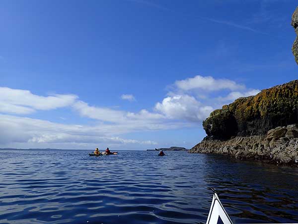 Hoping to take advantage of the wind for a little rock hopping/surfing we cut across the bay to head up the north channel in relatively sheltered conditions and were soon met by an increasing swell as we approached Luinga Bheag. Once we reached the west side of the island we found sea conditions that afforded the group an opportunity to ride some respectable waves, a gauntlet taken up by two members of the group, thankfully without any unintentional baths, whilst other members held back to take in spectacular views of Eigg and Rum.