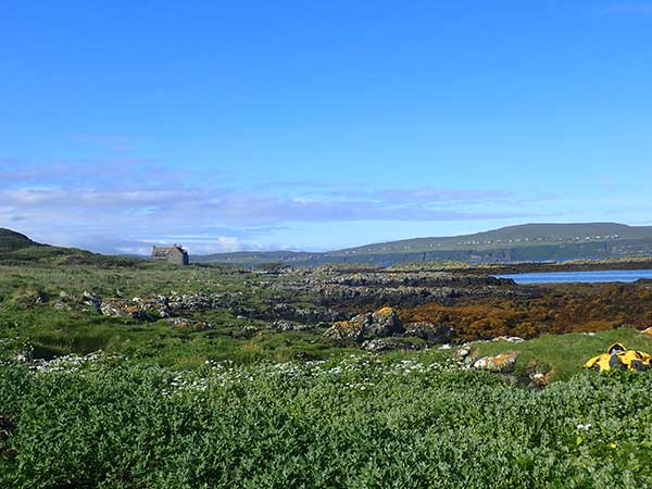 Sunday dawned calm and we were on the water ahead of schedule. Continuing up to the head of the loch we looked into the fish dam, which must have been a great source of fish back in the day. Travelling along the south coast of Oransay and out into loch Sunart, the waters were calmer than the previous afternoon and it was decided to cross to Sligneach Mor. Out in the open the SE wind was creating some movement and we were treated to a group of porpoises gleefully heading west across our path. We tracked around the back of the island and from there to the south coast of Ardnamurchan.