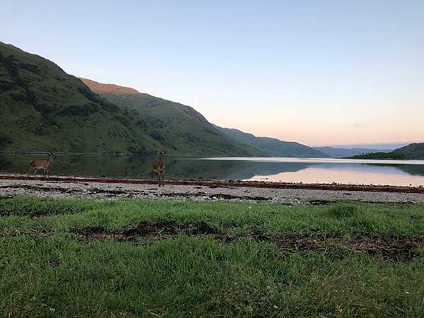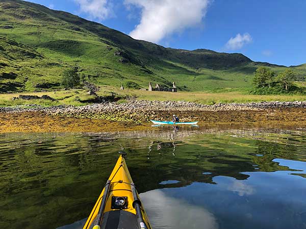 Sunday morning was calm and clear and we had some early morning visitors - deer breakfasting around the tents. We packed up quickly to make the most of the outgoing tide, passing the ruined houses at Ardnamurach and stopping at Tarbet. The wind picked up and was against us as we crossed the loch and headed for Inverie, unfortunately the cafe was closed and lunch was eaten on the beach. Finally back across the loch and home to Mallaig, a great trip into an amazing remote spot.