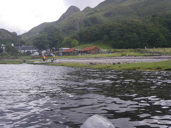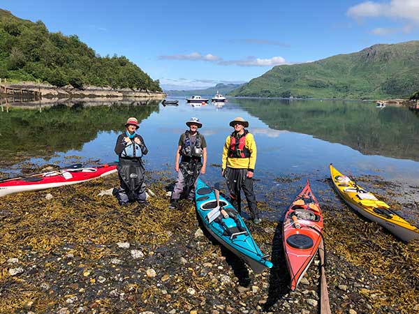 On Saturday morning the group had shrunk to three due to one member having taken unwell, but quickly became four again when joined by a late comer. They set off from Shieldaig and headed past Shieldaig Island which is covered with mature Scots Pines grown from seeds brought from Speyside to supply timber for building ships for the Napoleonic wars. Having rounded the peninsula north of Shieldaig, they caught a glimpse of the ancestral home of Roger Lanyon’s Grandfather (Johnny MacKay) at Bad Callda. From there they crossed the tidal flow at the narrows separating Loch Torridon from Upper Loch Torridon and headed to the sheltered harbour of Loch Diabaig hoping to get a cup of coffee at the famous Gille Grighde (oyster catcher). However, the café was shut, and the rain had set in, so lunch was taken sheltering behind a building on the old walled jetty watching climbers scaling the great gneiss slab south of the village. Refreshed after lunch the group made the short crossing to the Aird peninsula and after a quick peek into Loch Beag, they paddled south back towards Shieldaig, catching sight of a lone porpoise on the way. On passing Shieldaig Island the group spotted the resident sea eagle atop one of the Scots Pines. After having a cup of tea at the wonderful Nanny’s Café in Shieldaig the group set off for the campsite. By this time the triathletes were starting to arrive at the finishing line having set off on the swim section at 5am!