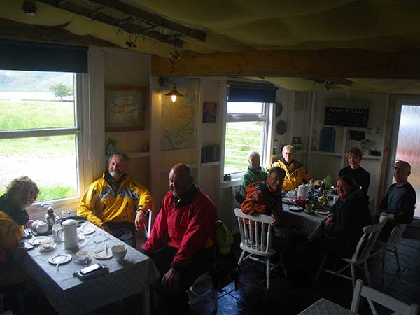 Sunday dawned blue and flat calm, though throughout the day any number of different conditions were experienced. The house, built by Lord Palumbo in 1985, looked fine in the morning sun. It was decided to pay another visit to the puffins, so headed north again to Eilean Creagach. Once puffined-out (if that’s possible), and with the seals singing us away, a westerly diagonal was taken from Eilean Garave towards Loch Losait, where 1st. lunch was taken. Various splashes in the water and sightings of smaller fins were probably porpoises, but they were too distant to be certain. Travelling south down the coast, the Ascribs soon looked far away. A waterfall, visible from the islands, was a long way south and quite spectacular. There were a couple of rock slides from the surprisingly high, steep and rugged cliffs along this coast, apparently made up of “Jurassic sedimentary rocks .... capped by large thicknesses of Lower Tertiary plateau lavas and pyroclastic rocks”. A few basalt columns were also visible.