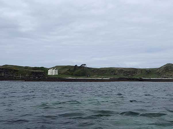 A peaceful and calm night was followed by an early shower. The forecast was still set to be F4 gusting 5 from the N/NW. After a brief conflab it was decided to go for Inch Kenneth and damn the torpedoes. On the water by 9.15 the following wind took us swiftly, if a little uncomfortably, to Inch Kenneth. The seas were hitting the island and the prospect of turning SW along the shore with a breaching sea was not very enticing, so a portage across the waist of the island was undertaken, to the calm waters on the southern side. After a refuelling break the graveyard and church were explored and a visit to the old Mitford House brought us together with the caretakers and their attractive pets (dog and cat), which proved interesting. Not wanting to tarry long, due to the uncertainty of the northward journey back to Ulva ferry and forecast of strengthening winds, we soon set off, rounding the end of the island into the teeth of a brisk, but not unmanageable breeze that increased in lumpiness once out of the protection of the islands. The crossing was made in good time and the Ulva shore was followed round into the Sound and back to Ulva ferry and a welcome cuppa in the camper van. Distance 13kms