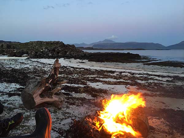 The decision was made to about turn, and enjoy a helping hand from the wind as we headed back home, we paused to observe inquisitive seals, a particularly large and dense bloom of moon jellyfish, and a couple of campers who had pitched their tent for the night on the shoreline of Camas Ghaoideil, by this time rain showers had set in, making for some atmospheric views on the last leg of the paddle.