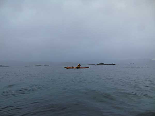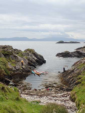 Gathering at Mallaig’s East Bay put-in point, we managed to pack and launch from the small amount of shore remaining at high tide and headed off towards the west side of Knoydart. With coffee/early lunch calling, we landed at Doune and then continued along the coast in pleasant sunny weather with a slight following breeze. After 14km we arrived at Rubha Ard Slisneach where the grass above the stony beach provided a huge area for camping. Tents were duly erected and the party took to the water again to paddle over to the Sandaig Islands. Rain came on during our passage and we arrived at the islands feeling distinctly damp. Formerly sheep grazed, the former camp spots are now well overgrown, vindicating our decision to camp earlier in the day. The rain relented as we got back, the wind died and the midges came out in force, socialising was therefore rather limited for the rest of the evening. 28km