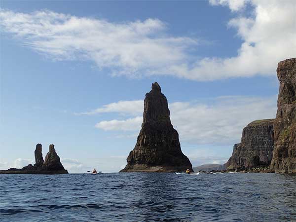 After a fine pair of arches, the stretch of coast north of Ardmore became high-ish cliffs with rocky, inhospitable foreshore and a series of waterfalls and dykes, one of which afforded a stony beach landing for lunch before rounding Waternish Point once the tidal stream changed direction. Although only a day after Springs the turbulence at the headland was bumpy but quite manageable. From here the Shiant Islands are clearly visible, along with Harris and Lewis. Despite the stream having just changed direction, it could be clearly seen flowing strongly like a river towards the north of the Ascrib Islands, which soon came into view. Choosing to avoid the turbulence, the coastal route was take south for a few kilometres before heading for Eilean Iosal, the most northerly of the Ascribs. A few hundred metres short of the island a minke whale came to check out the intruders and performed a few acrobatics, soon followed by a second one. Approaching the island the Atlantic Grey seals could be heard singing (to us!) from the shore and soon followed along behind, huffing and puffing. The next attraction was the puffin colony on the neighbouring Eilean Creagach. A healthy population, along with razorbills, gannets etc. After hanging out with the birds for a while, the exploration continued through the gap to the eastern side of Eilean Garave. The kelp beds along these coasts are dense and healthy looking. Missing the gap (perhaps inaccessible due to low tide) South Ascrib had to be circumnavigated to reach the house where it is suggested rough camping spots may be found. Dragging the boats to the raggy jetty and clambering up, it was observed that the door to the house was open. A representative was commissioned to go and meet the owners to see if camping might be possible. The answer was an unequivocal “no”. There being no camping on the for at least 6kms it was reluctantly conceded that the group could look for somewhere nearby, with the promise of a (non-existent) jetty and flat (hah!!) ground. After an extended and thorough reccie of the most difficult to negotiate terrain imaginable, sufficient space was found close to the top of the “beach” on tiny little patches of wild land full of holes and water. At low water the top of the beach was 100 meters or so of rough, sea-weedy boulders away. A council was held - there was nothing for it so, an evening of carrying and dragging commenced. Medicinal whisky was prescribed and by the time the boats were safely on the grass it was lucky there had been no injuries! After dinner one of the group found his tent to be on a separate part of the island (the tide having come in from both sides) and had to wade home. The camp spots turned out to be very comfy and there was a nice sunset to end the day, with the Stonehaven Club visible on the horizon on a neighbouring bit of island and Fladda Chuain, Eilean Trodday and Dunvegan Head silhouetted in shades of grey towards the east.
