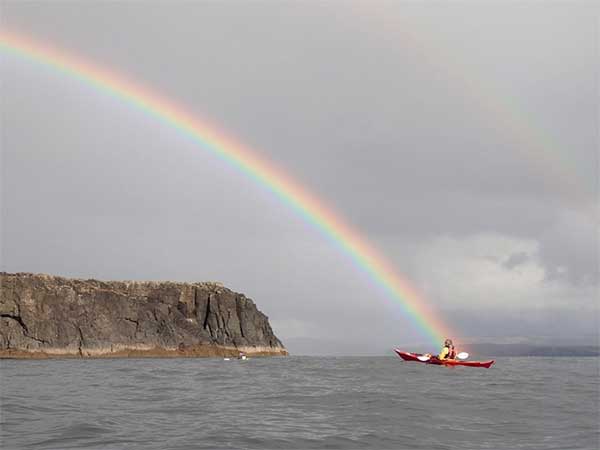 Saturday’s paddle started from Harlosh. We weren't the only paddlers to take advantage of the bright sunshine and good conditions, we were joined on the beach by four more paddlers but didn't see them on the water. We set off around Harlosh Island and Tarner Island (with its fabulous kelp beds and rock gardens with countless sea urchins and starfish, and a sea eagle sighting too), heading for Wiay, where we ate lunch at Camas na Cille. From there the paddlers crossed to Idrigill Point and around to the spectacular stacks of MacLeod’s Maidens, a long term goal of one of the group and what a day to achieve an ambition. On the return route,we went into more caves than I can remember being there – swell permitting – along with the most spectacular double arch near the end of the day. The sun shone even with the showers that were now coming over. They produced some beautiful rainbows.
