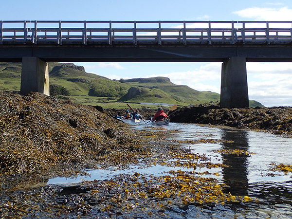 The following day started cool and dreich and it didn’t improve much for the rest of the day. Crossing the Sound again, we called in at the Rubha Fiola outdoor centre. Sadly this was not in use and we traversed the Sound again and threaded our way between the islands to land at Cullipool. A short walk to the Atlantic Centre revealed it to be closed, so no cafe for us. Onwards we went and through Cuan Sound, another well known place for fast tides. As these were semi-neap, we had an uneventful passage with the tidal flow and just boils and swirls to contend with. Paddling northwards now, we passed under the Bridge over the Atlantic that links Seil with the mainland, through the narrow Clachan Sound to the north end of Seil to camp on Eilean Buidhe.