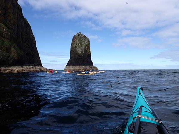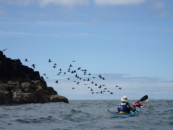 Our final day and beautiful weather and conditions. We broke camp and headed anticlockwise around Eigg, where we encountered another Eagle, a Hen Harrier and Kittiwakes, plus Guillemots, Black Guillemots and Razorbills who were undaunted by our presence and hardly even bothered to move out of the way! The swell was much less, tempting some to do some rock hopping at last, although the larger sets of waves were unusually big and this did catch out one member. With no real harm done apart from them being somewhat wetter, we carried on to the pier and lunch, followed by coffee and cake at the newly refurbished cafe. The final stage was to cross to Arisaig; a quiet but easy crossing with just a few Shearwaters and again no cetaceans, back to waiting family who kindly shuttled us back to our cars parked in Mallaig.