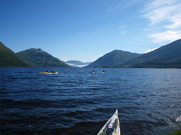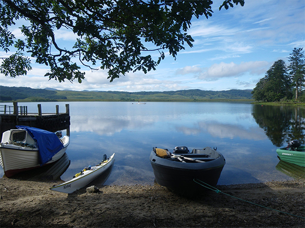 The following day we were up and away early with a following wind aiding our passage to the southern shore of the loch and round the islands of Eilean Mhic Dhomhnuill Dhuibh and Seilag before stopping for a leg stretch at Gorstanvorran. A good forestry track runs down this side of the loch from Glenfinnan to Polloch which can be used by walkers and cyclists. We continued to follow the shore westwards and pulled in to the estuary of the river Polloch where we admired the beautiful white water lillies, before heading for Eilean Fhianain (known as Finnan’s Isle or the Green Island). This island has been a burial ground for centuries and boasts a ruined chapel from which an ancient bronze bell which was rung to mark a burial was stolen a few years ago. Having cooled off in the water and spent some contemplative time on the island we set off on the last few kilometres back to Dalilea.
